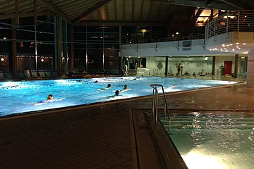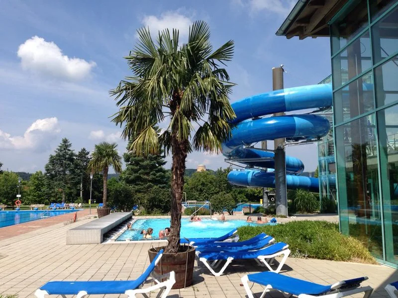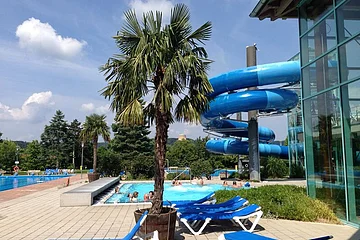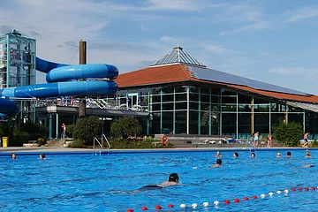 Hallen- und Freibad mit 87,5 m langer Wasserrutsche, Infrarotkabine, Sanarium, Dampfbad, Warmwasserbecken, Restaurant, Beachvolleyballfeld, Liegewiesen und vielem mehr. Revision vom 15. bis 25.09.2025!